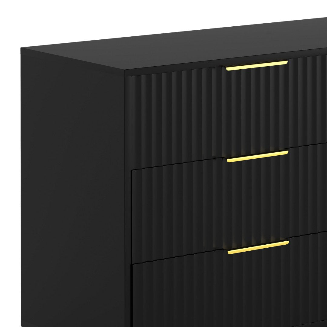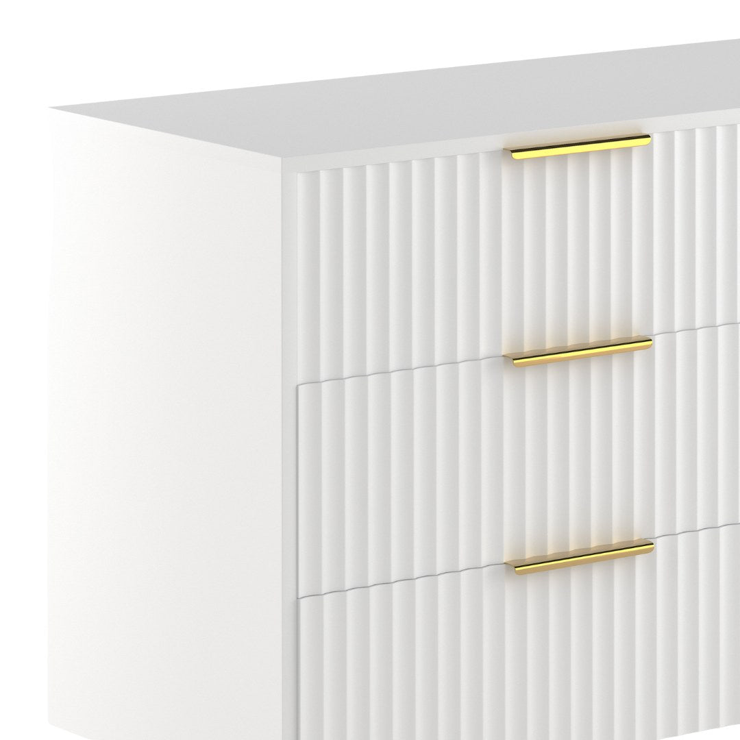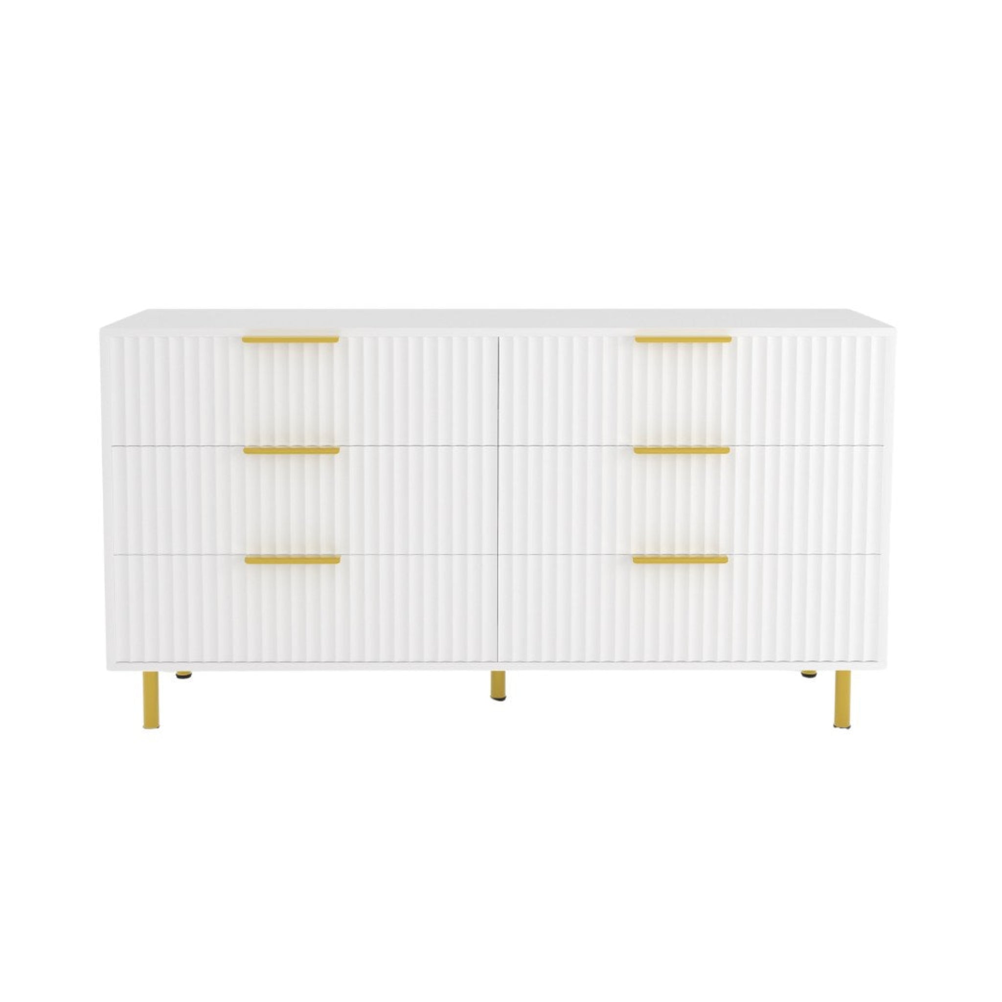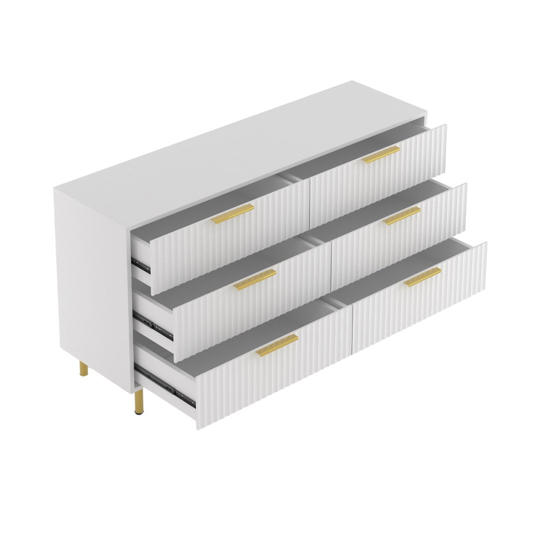 The Luna Dresser delivers practical storage with a refined finish. Six smooth-glide drawers offer generous space for daily essentials, while vertical fluted fronts, matte gold hardware, and slim metal legs create a bold, modern silhouette. Available in matte white or matte black, it’s a statement piece with real purpose.