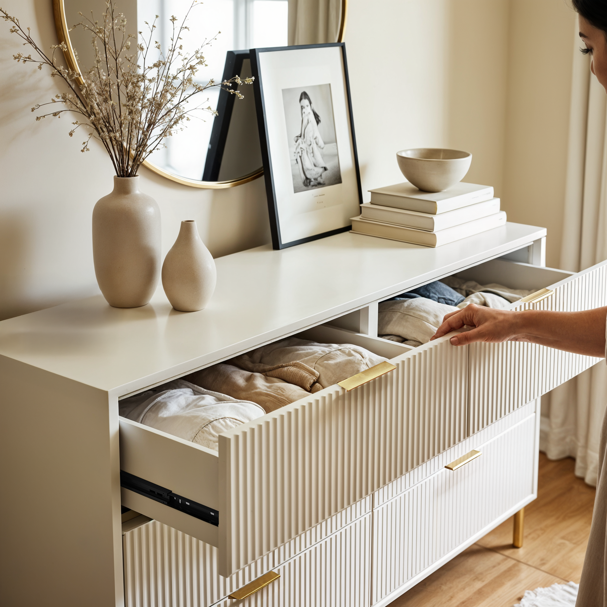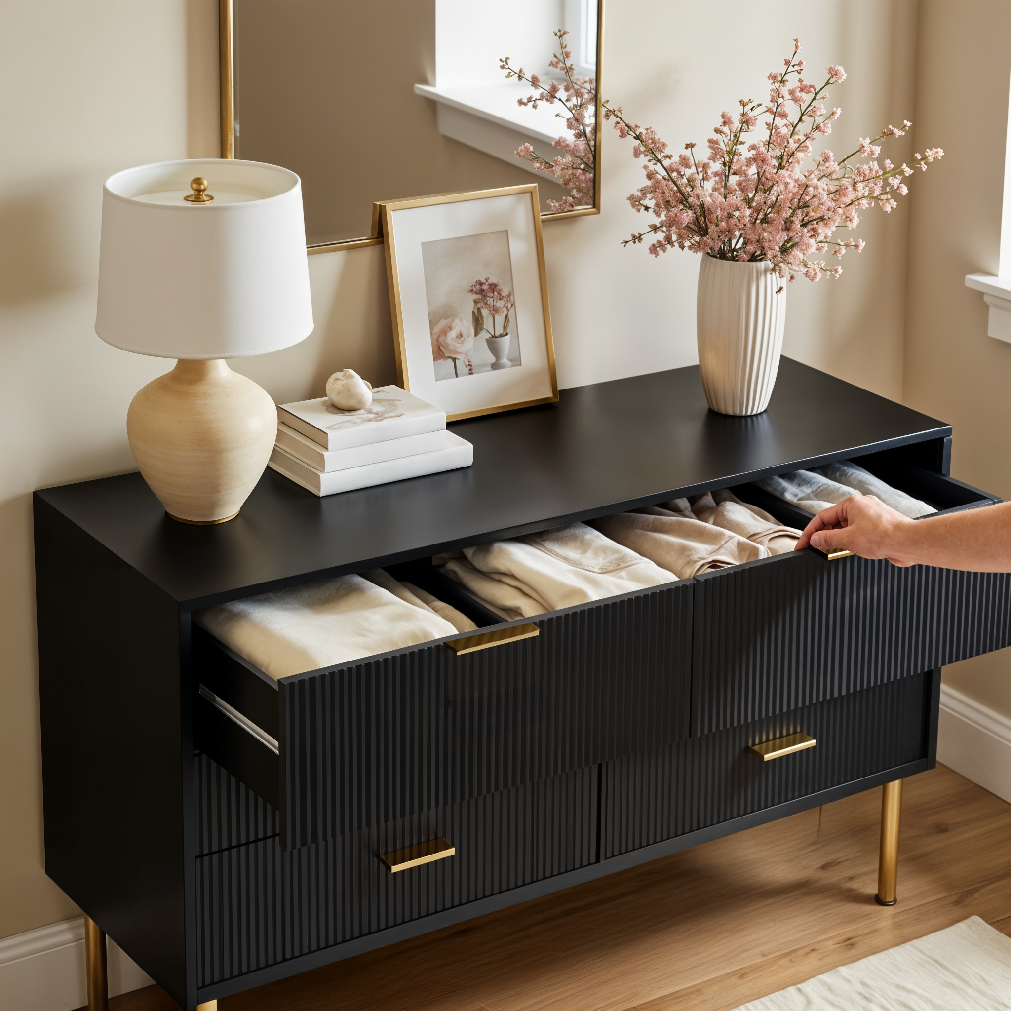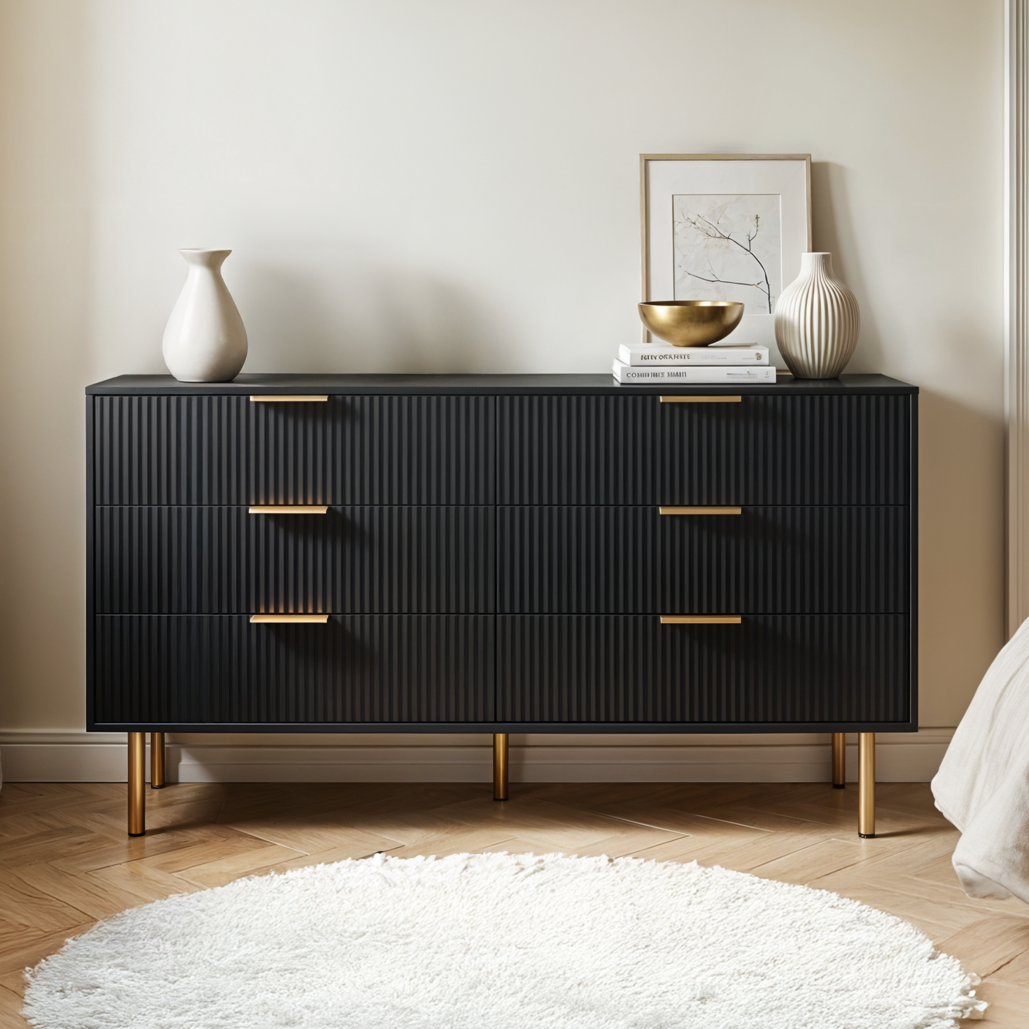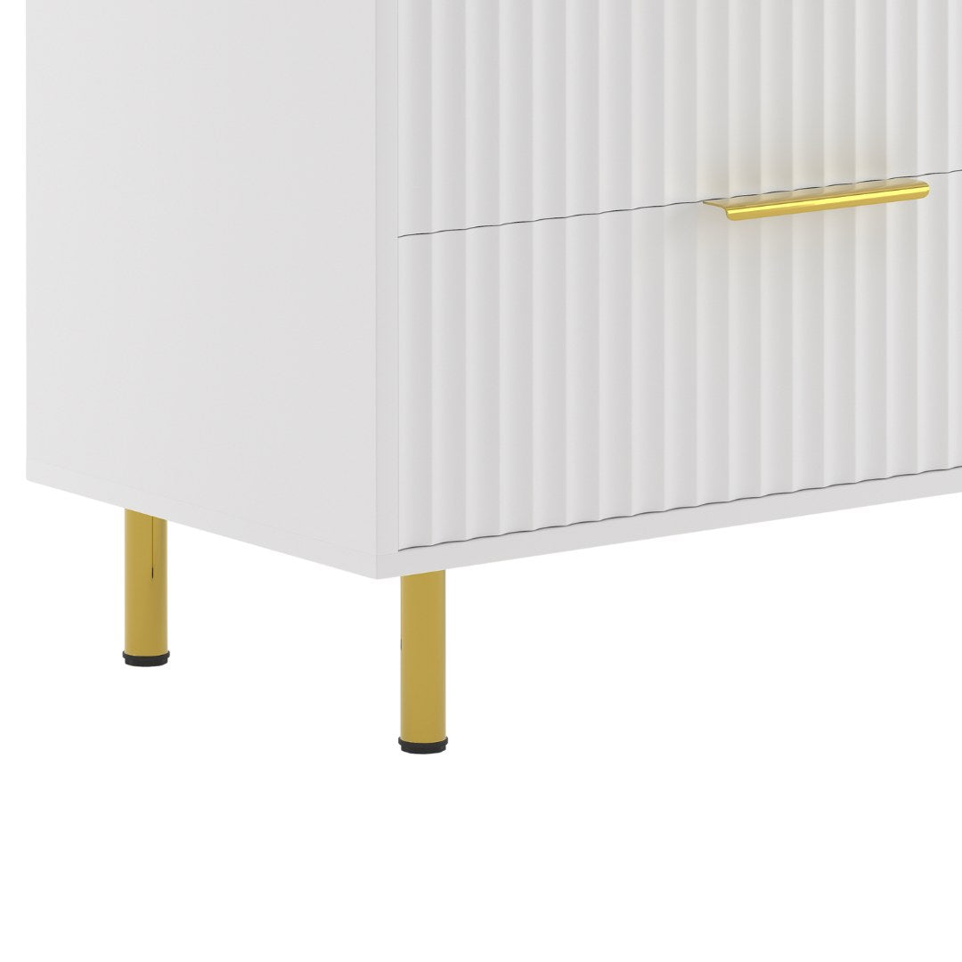 The Luna Dresser delivers practical storage with a refined finish. Six smooth-glide drawers offer generous space for daily essentials, while vertical fluted fronts, matte gold hardware, and slim metal legs create a bold, modern silhouette. Available in matte white or matte black, it’s a statement piece with real purpose.
