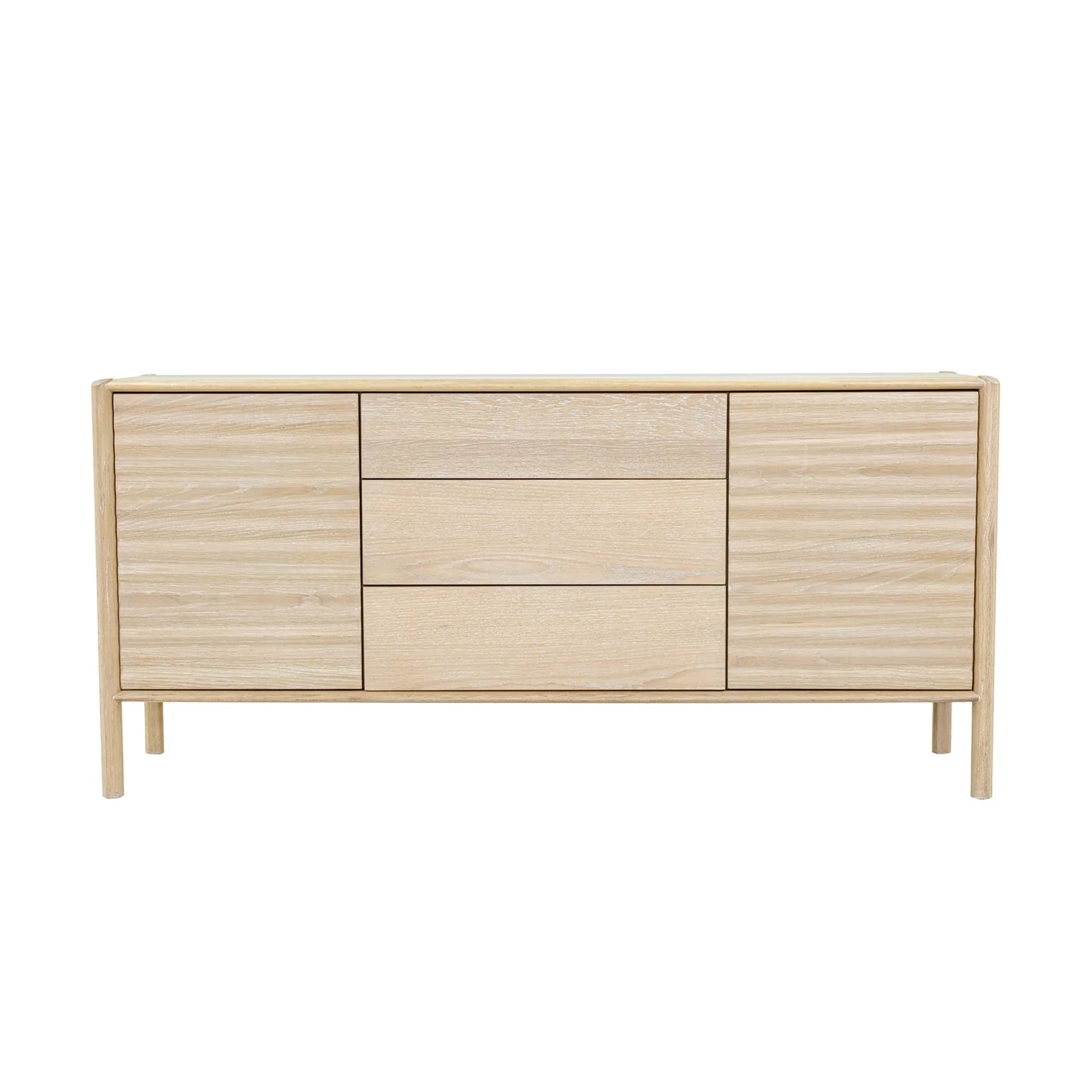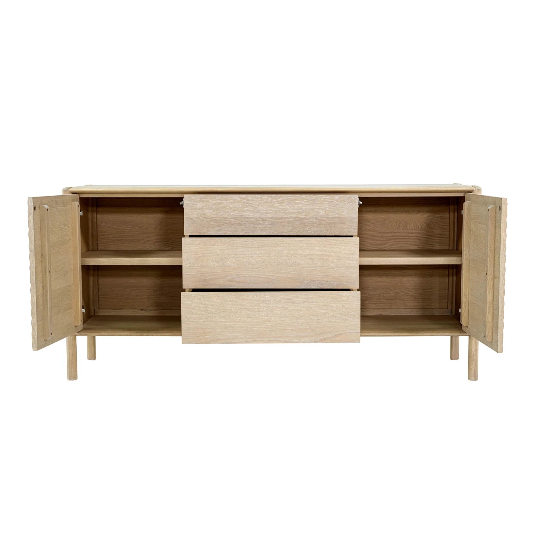 Two side cabinets provide easy room for dishes and serveware, while the central drawers are perfect for linens, cutlery, and everyday essentials. The slim, elevated base keeps the piece feeling light and open, making it an effortless fit for both small and spacious rooms.